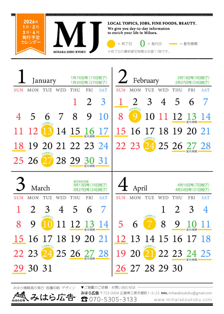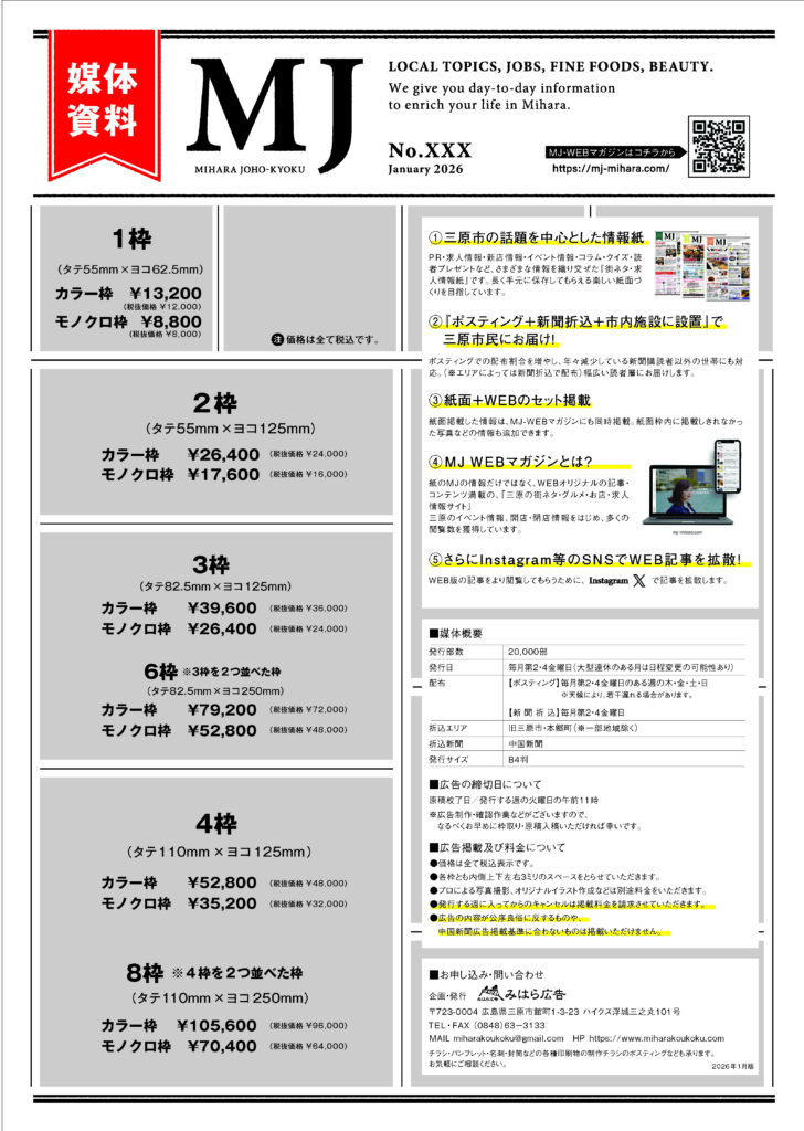 三原市のお店情報・求人情報・イベント情報の他に、コラム、そして読者プレゼントありの、三原純度99.9%フリーペーパー。MJのロゴがお馴染み、三原市民に自社・自店のことを知ってもらうなら、これ一択です!